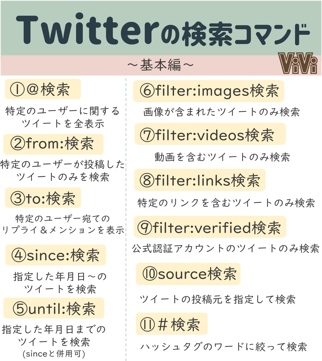 - 特定のユーザーから特定の単語を含まないツイートを検索: `from:ユーザー名 -寿司`